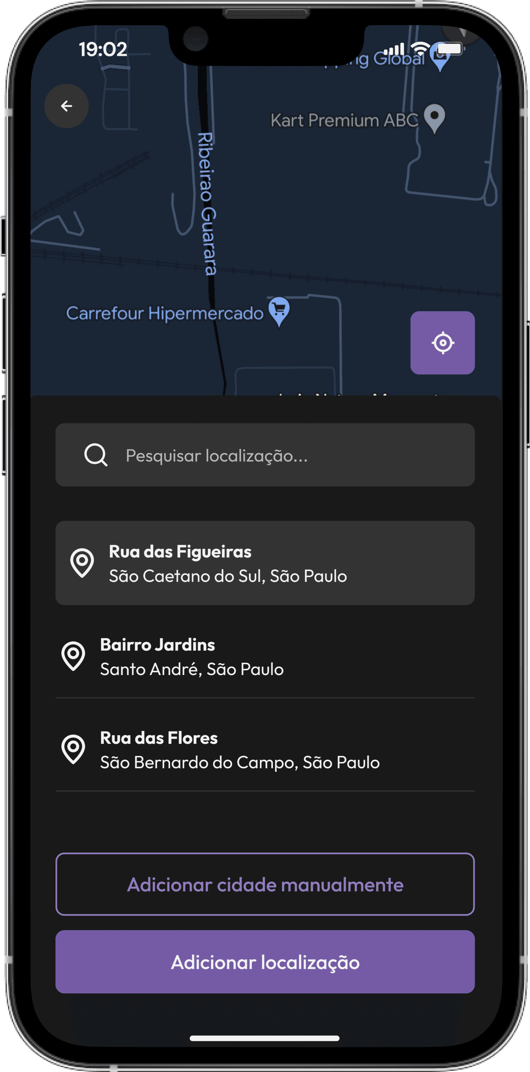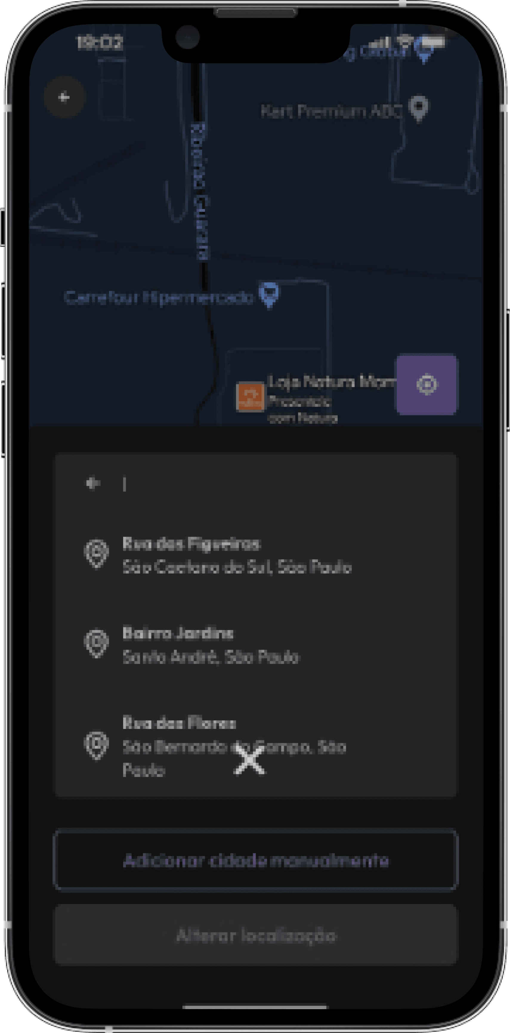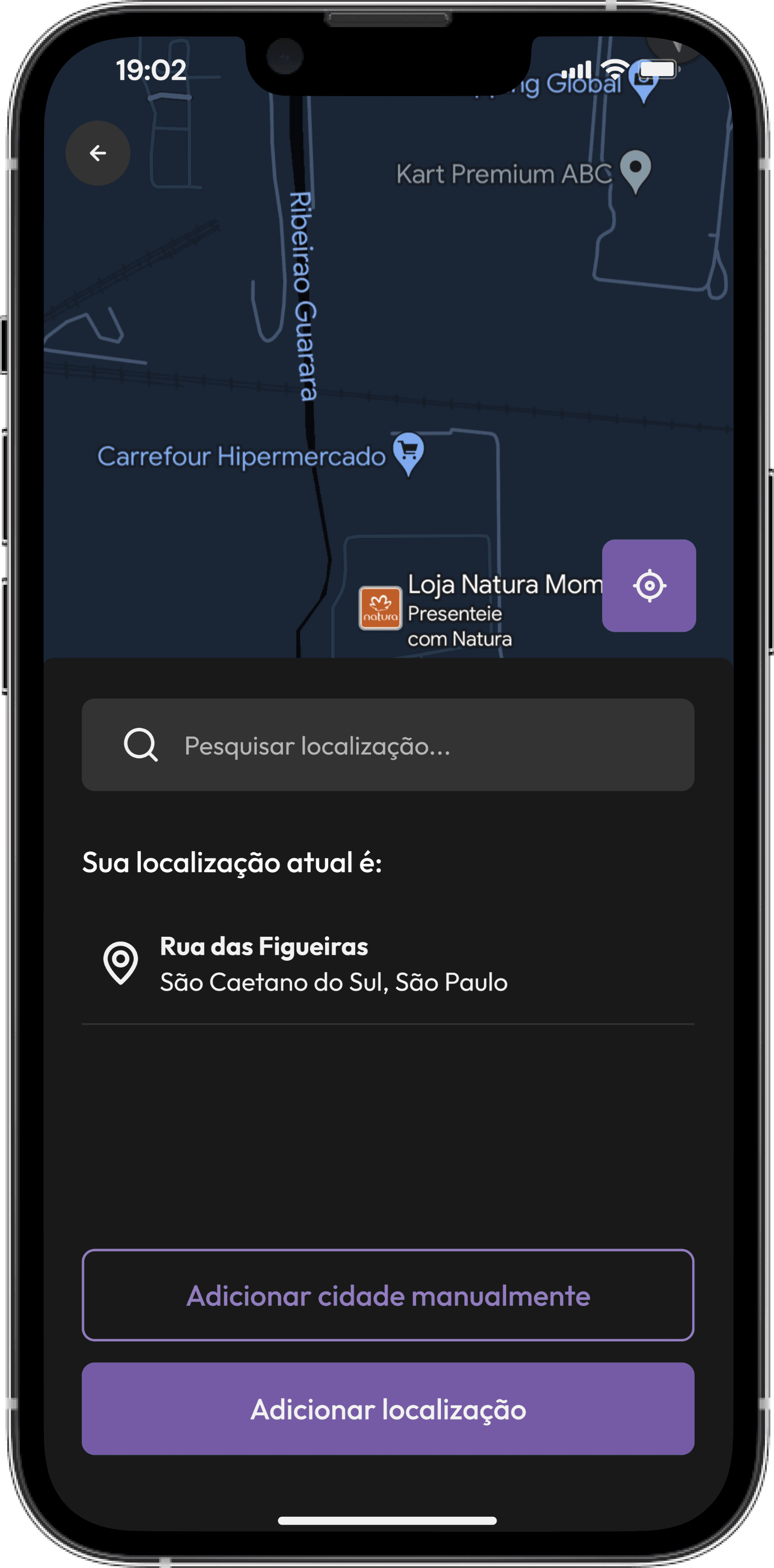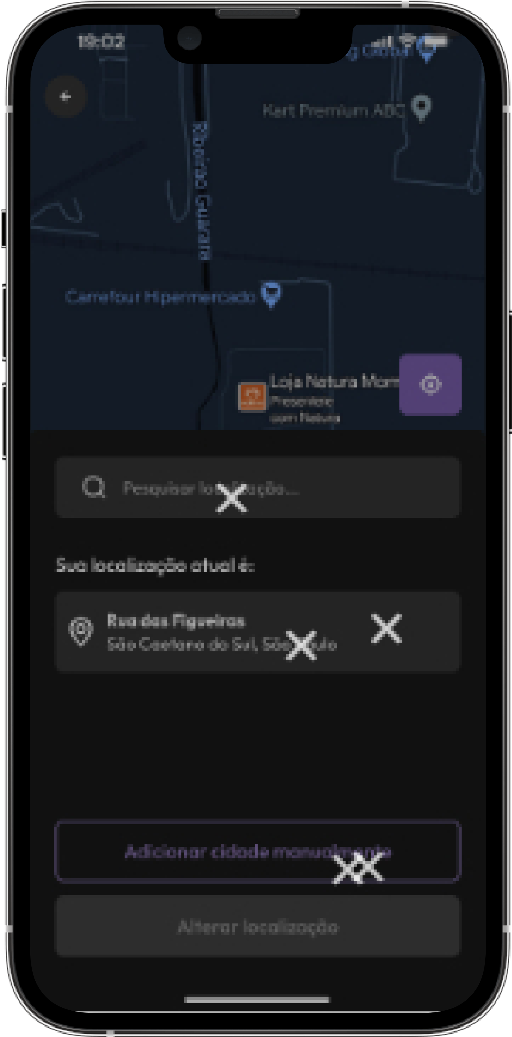 A tela de localização mostra a atualização atual do usuário, ao clicar na barra de pesquisa ele pode pesquisar uma nova localização, selecionar e depois clicar no botão "alterar localização" para confirmar a ação.