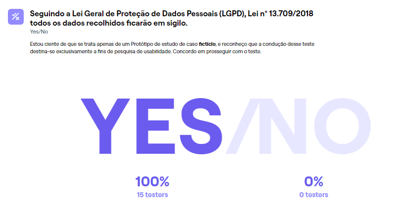 Comecei o teste aplicando uma pergunta de verificação de Proteção de Dados, assegurando que se trata de um teste anônimo e não há coleta de dados verdadeiras como dados de cartão de crédito e outras informações pessoais.
