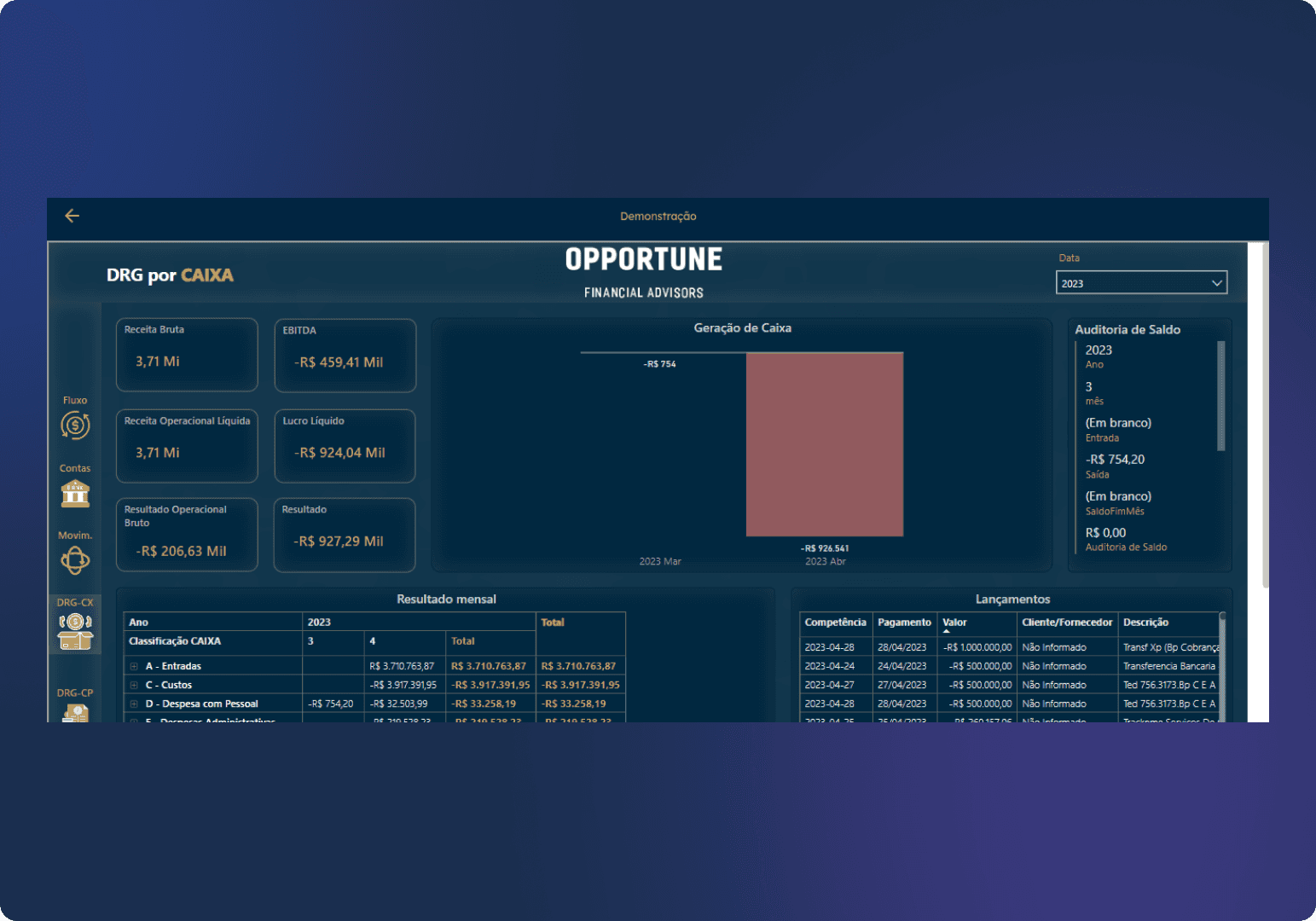 Além de trabalhem prestando consultoria para outras empresas, criaram uma plataforma que hoje é conhecida como o AUDIT - Auditor Financeiro, que fornece relatórios customizados e análise de desempenho financeiro para gestores e auditores financeiros.