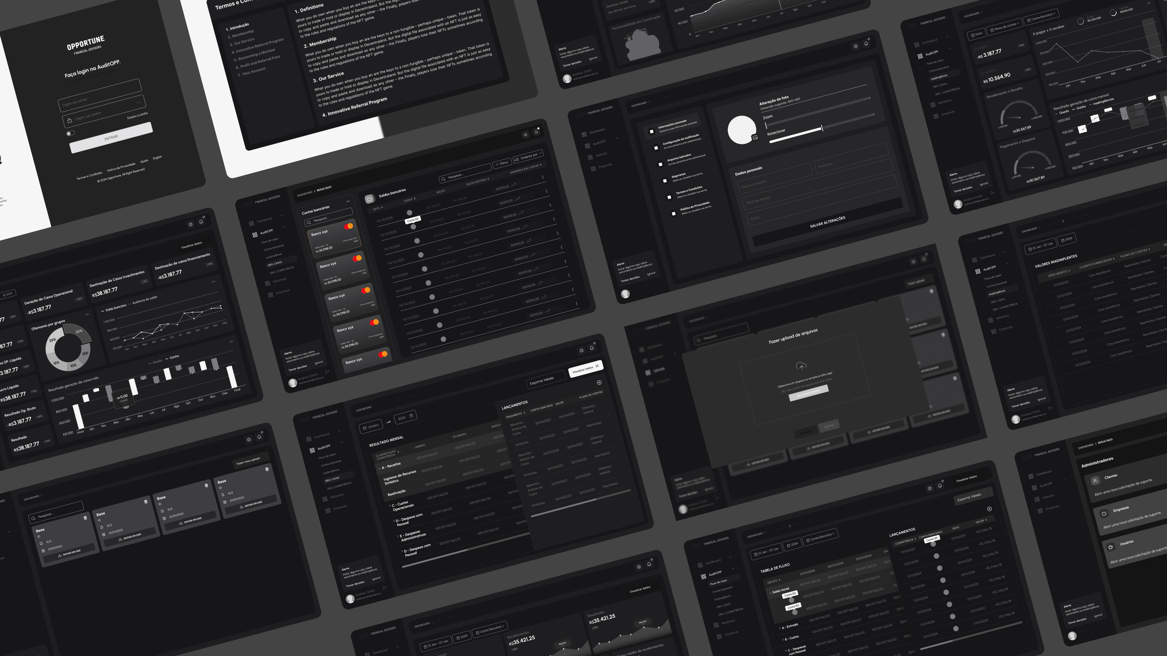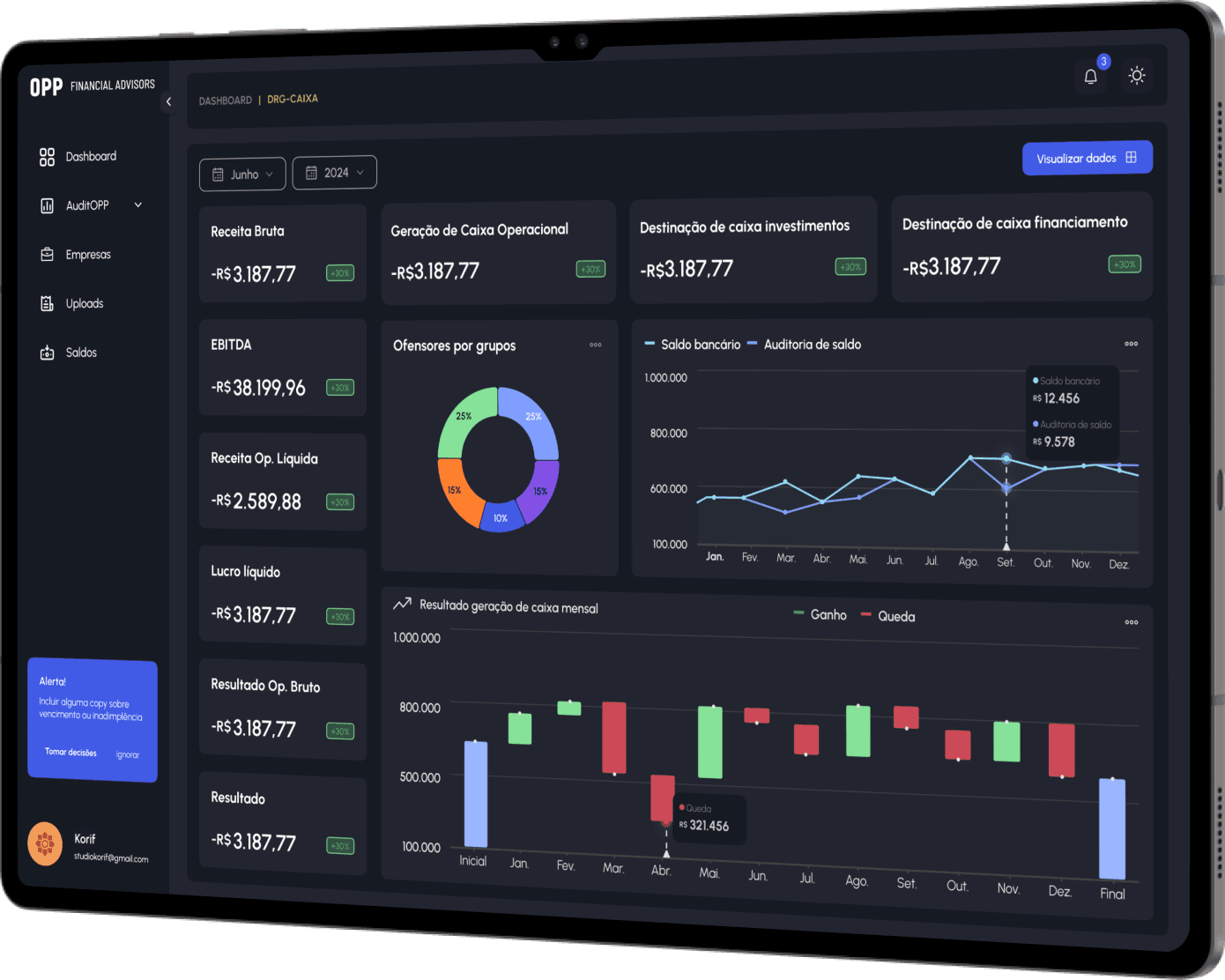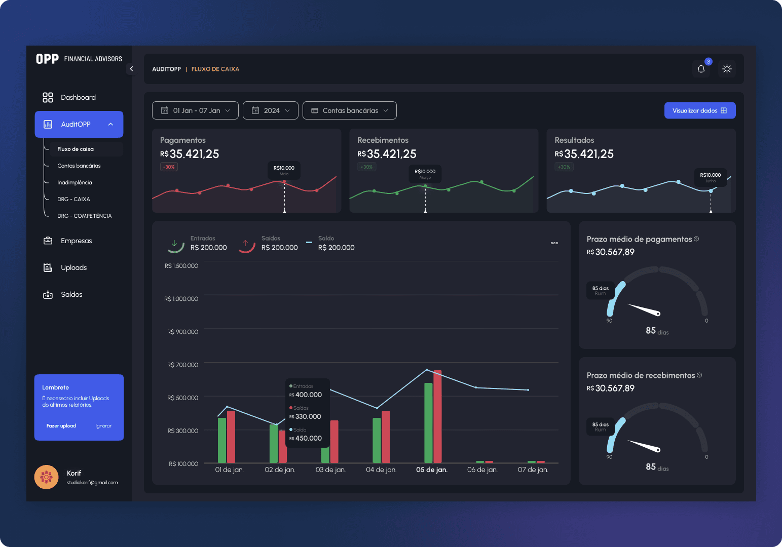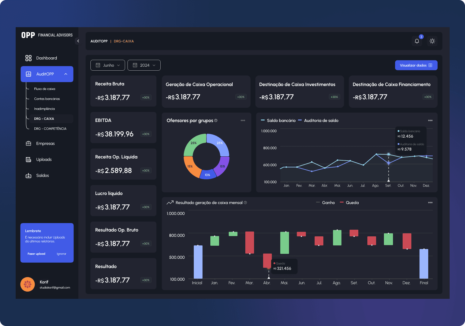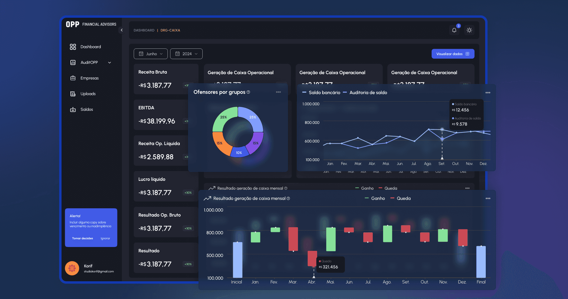 Gráficos para análises de inadimplência, fluxos de caixa, parcelamentos, saldos bancários;