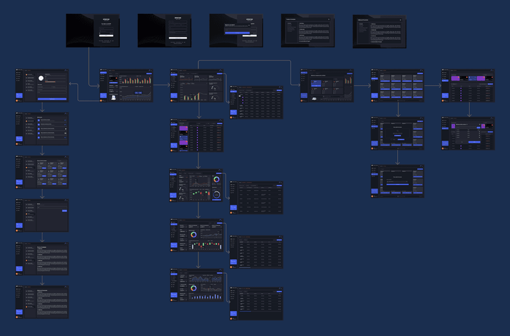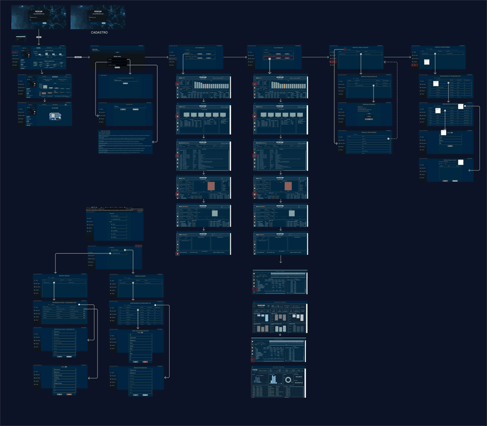 Mapeamos o fluxo do usuário com as telas atuais do sistema para ter uma visão macro e assim identificar possíveis melhorias.